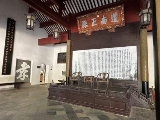 在岳麓書(shū)院中央的講堂,陳列著《岳麓書(shū)院記》的屏風(fēng)。(本報(bào)記者 劉書(shū)文攝)