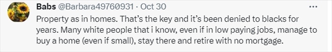 還有網(wǎng)友表示,美國(guó)政府在加劇美國(guó)財(cái)富不平等方面“功不可沒”。在美國(guó)政策高壓之下,非裔甚至不配擁有住房。