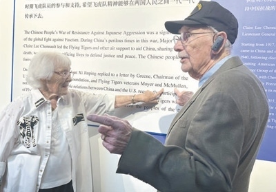 走進博物館,代表團成員在一張張老照片、一件件珍貴實物前流連,認(rèn)真聆聽講解,還不時與身邊親友交談。麥克馬倫在展板上看到自己的名字后,興奮地向妻子珍妮弗指了指名字的位置。他曾擔(dān)任B—24轟炸機機頭炮手和助理飛行機械師,在昆明和成都參加對日作戰(zhàn)??粗AЧ窭锏恼蛊罚锌骸懊乐袃蓢嗣竦挠颜x將延綿不斷。”