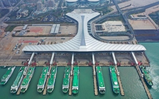 這是??谛潞L裝碼頭客運(yùn)綜合樞紐站項(xiàng)目(11月29日攝,無人機(jī)照片)。新華社記者郭程攝