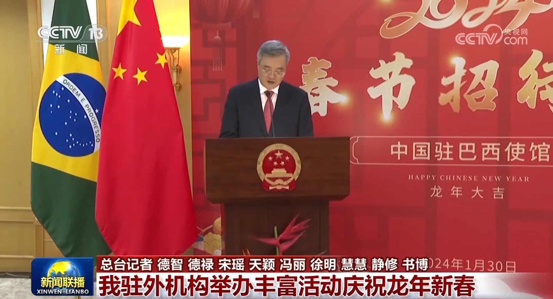 央視網(wǎng)消息(新聞聯(lián)播):連日來,我駐國際組織代表團(tuán)和駐多國使館舉辦春節(jié)招待會等活動,共慶龍年新春。