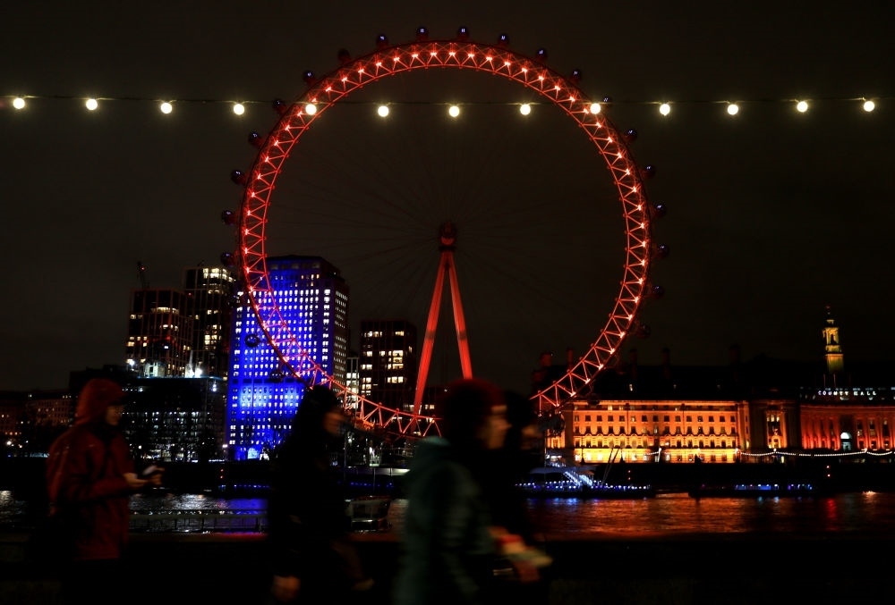 2月8日,在英國(guó)倫敦,行人走過(guò)亮起紅色燈光的“倫敦眼”。新華社記者 李穎 攝