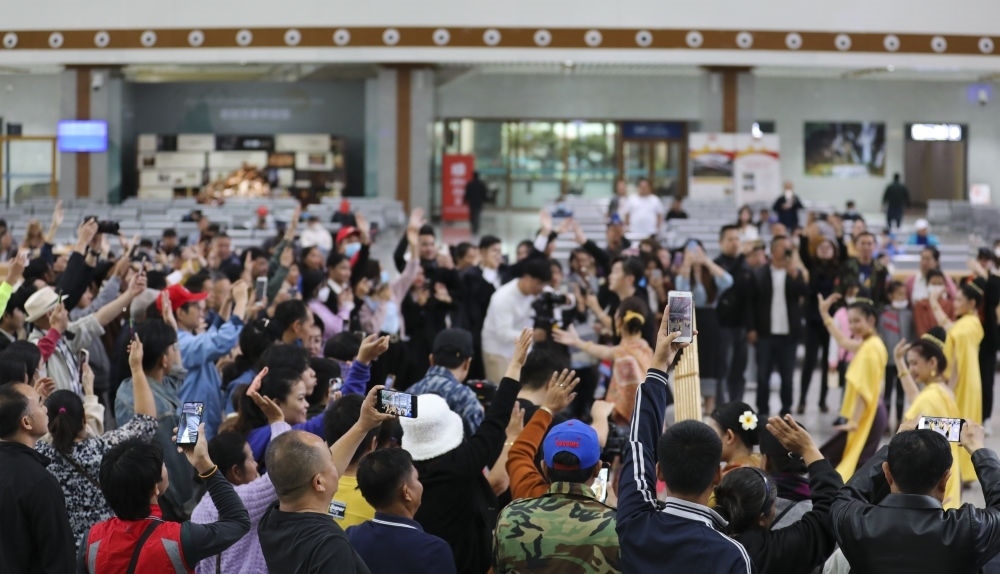 1月26日,旅客在中老鐵路萬象站候車廳觀看當(dāng)?shù)貍鹘y(tǒng)舞蹈表演。