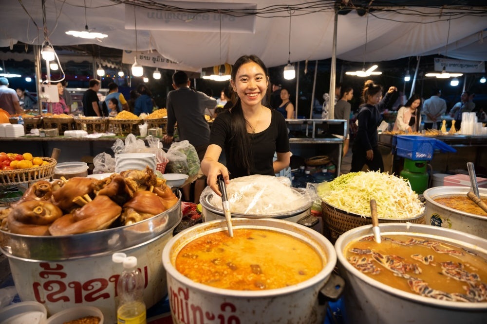 這是2月16日拍攝的老撾瑯勃拉邦夜市一景。