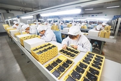 山東省榮成市港西鎮(zhèn)一家外資電子制造企業(yè)的工人們?cè)陔娮又悄茉O(shè)備生產(chǎn)線上忙碌著,趕制出口國(guó)外的訂單產(chǎn)品。