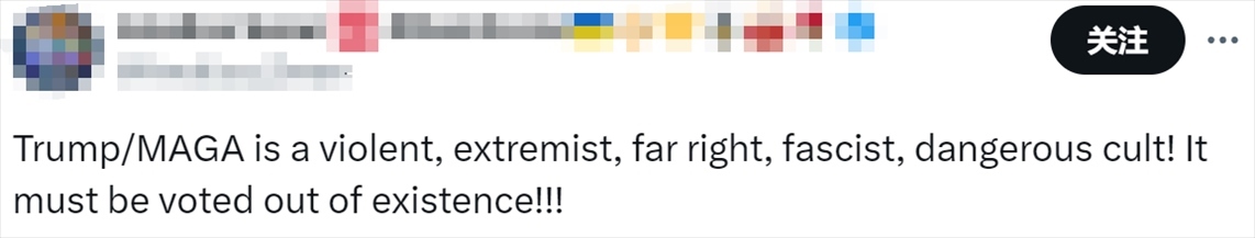 有人喊話:“特朗普/MAGA(即讓美國再次偉大口號(hào))是一個(gè)暴力的、極端的、極右翼的、法西斯的、危險(xiǎn)的邪教!一定要用投票讓它不復(fù)存在!??!”