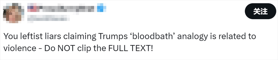 另一方面,一些特朗普的支持者則抨擊民主黨人斷章取義。有人說:“你們這些左翼(民主黨)聲稱特朗普的‘屠殺’與暴力有關(guān)——?jiǎng)e斷章取義!”