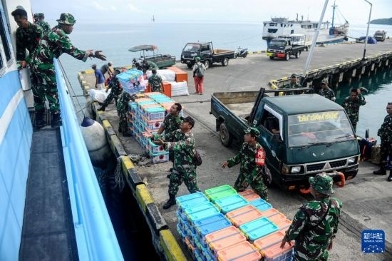 3月25日,在印度尼西亞巴韋安島,印尼軍人搬運印尼國家災(zāi)害管理局發(fā)放的救援物資。