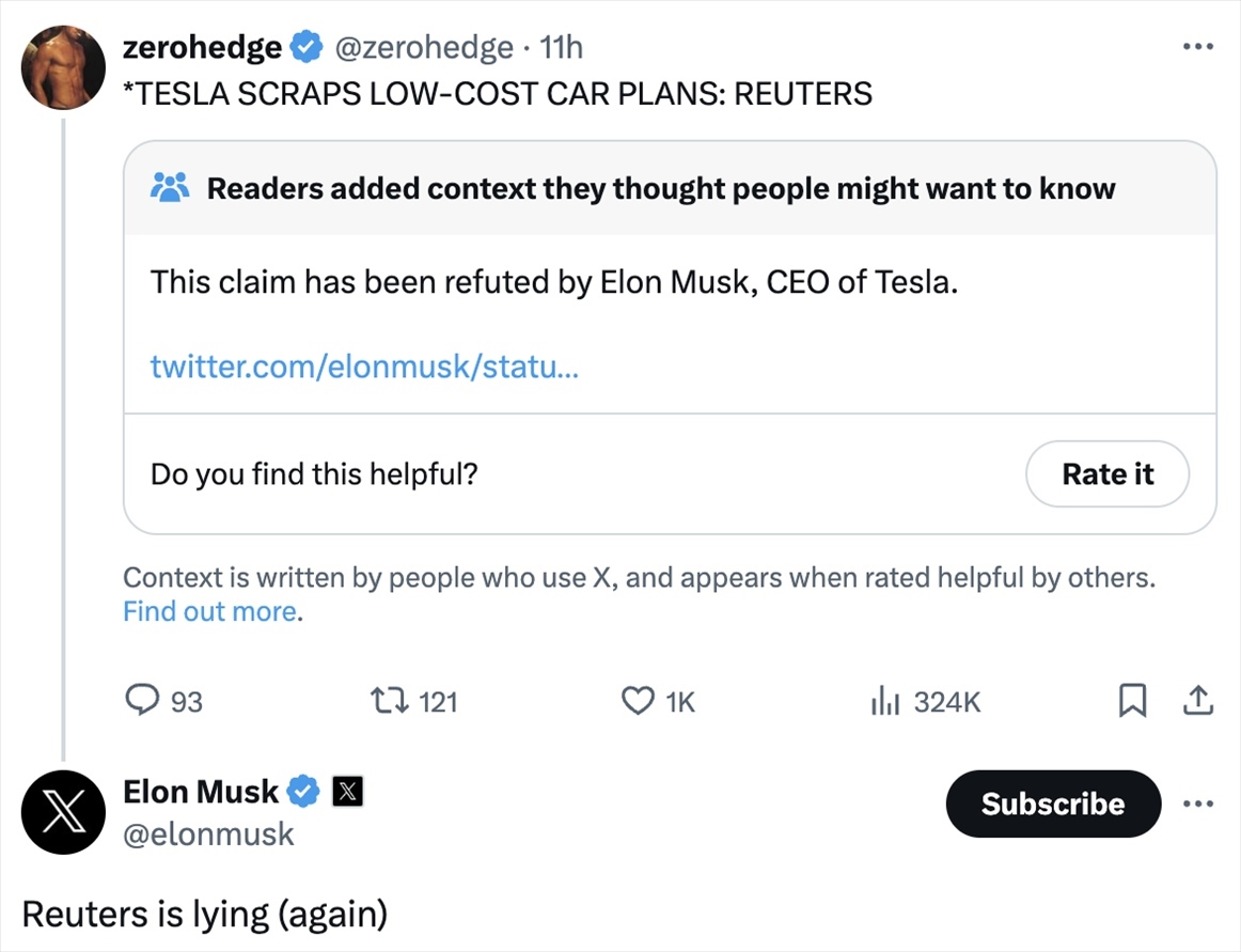 隨后特斯拉CEO埃隆·馬斯克在旗下社交媒體平臺X上發(fā)文否認了這一報道,稱其“又在說謊”。