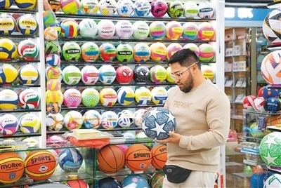 浙江省義烏國際商貿(mào)城,來自厄瓜多爾的外商在選購球類。時寬兵攝(人民視覺)