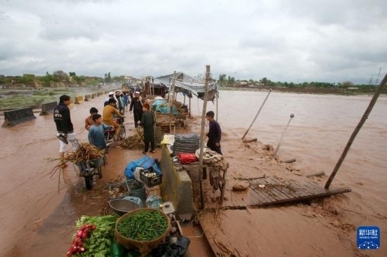 4月15日,在巴基斯坦西北部城市白沙瓦,人們涉水前行。新華社發(fā)(奧馬爾·卡尤姆攝)