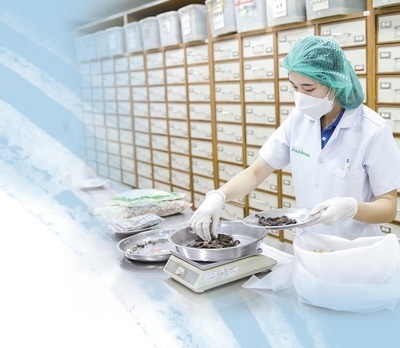 泰國(guó)華僑中醫(yī)院藥房?jī)?nèi),工作人員在稱量中藥。 張慧珊攝