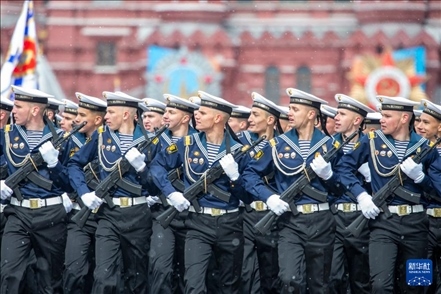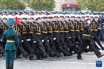 5月9日,在俄羅斯首都莫斯科,士兵列隊走過紅場。新華社記者 白雪騏 攝