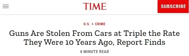 報(bào)告還分析了FBI全美事件報(bào)告系統(tǒng)的犯罪數(shù)據(jù),發(fā)現(xiàn)從汽車中盜竊槍支的行為與汽車盜竊的總體趨勢(shì)背道而馳,在過去十年中,從汽車中盜竊其他物品的比率下降了11%,而槍支盜竊率卻增長(zhǎng)了200%。