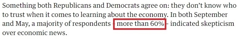 而無論是共和黨人還是民主黨人,幾乎所有受訪者都同意的一點是:在了解經(jīng)濟情況方面,他們不知道該相信誰。民調顯示,超六成美國人對經(jīng)濟新聞的真實性表示質疑。