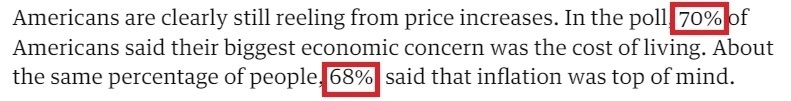 在《衛(wèi)報》發(fā)布的民意調查中,有70%的受訪者表示,他們最大的經(jīng)濟擔憂是生活成本;大約同樣比例的人(68%)說,通貨膨脹是他們最關心的問題。
