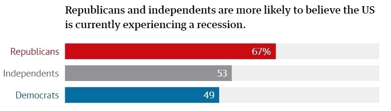 哈里斯民調公司進行的民調顯示,67%的共和黨人認為,美國經(jīng)濟正在萎縮,通貨膨脹正在加劇,整體經(jīng)濟正在惡化;而民主黨人中持相同觀點的人只有49%;此外,共和黨人比民主黨人更加相信,拜登政府的管理不善導致經(jīng)濟惡化。