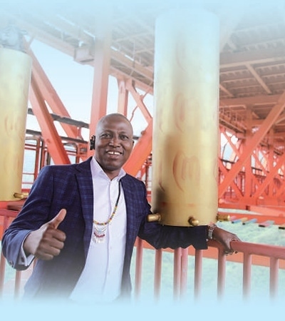 在位于安順市的壩陵河大橋,尼日利亞駐上海總領事館商務專員哈桑在觀光步道中央拍照留念。