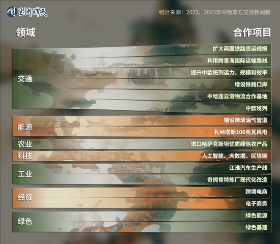 這兩年間,中哈提到的合作項目,涉及交通、能源、工業(yè)、農(nóng)業(yè)、經(jīng)貿(mào)、科技等多個領(lǐng)域,其中出現(xiàn)頻次最多的,是交通——從“中歐班列”、“增設(shè)鐵路口岸”,再到“中哈連云港物流合作基地”。