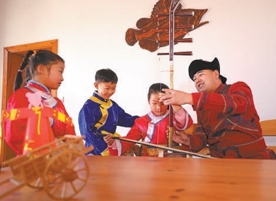 哈拉新村村民在教當(dāng)?shù)睾⒆友葑鄠鹘y(tǒng)樂器。齊齊哈爾大學(xué)孟加拉國籍留學(xué)生 衣睿實攝“在哈拉新村,我看到四弦琴造型的村口大門、魚叉狀的路燈,還有整整齊齊的‘介字房’……這里獨(dú)特的民族文化、濃郁的鄉(xiāng)土風(fēng)情,給我留下了深刻印象。當(dāng)?shù)丶缺A魝鹘y(tǒng)的達(dá)斡爾族人文特征,又開發(fā)文化體驗館、民族特色美食等現(xiàn)代旅游資源,重視文化保護(hù)和傳承的做法值得借鑒?!?/p>