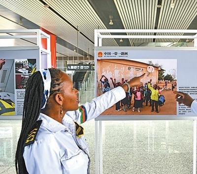 3月22日,在肯尼亞首都內(nèi)羅畢,當(dāng)?shù)厝嗽诿蓛?nèi)鐵路內(nèi)羅畢火車站參觀中非共建“一帶一路”務(wù)實合作圖片展。新華社記者 韓 旭攝