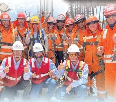 在中企承建的秘魯庫(kù)斯科圣安東尼奧國(guó)立大學(xué)升級(jí)改造項(xiàng)目施工現(xiàn)場(chǎng),中秘兩國(guó)建設(shè)者合影。水 源攝