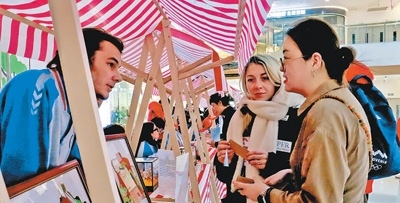 外國(guó)游客在北京延慶萬(wàn)達(dá)廣場(chǎng)體驗(yàn)市集。