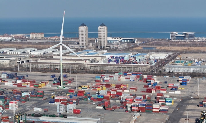 這是天津自貿(mào)試驗(yàn)區(qū)東疆片區(qū)一景(2024年3月20日攝,無(wú)人機(jī)照片)。新華社記者 趙子碩 攝