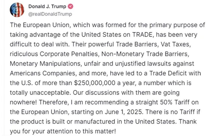 他說,美歐之間的磋商停滯不前?!耙虼?,我建議自2025年6月1日起,對(duì)歐盟商品統(tǒng)一征收50%關(guān)稅。若產(chǎn)品在美國(guó)本土生產(chǎn)制造,則免征關(guān)稅?!?/p>