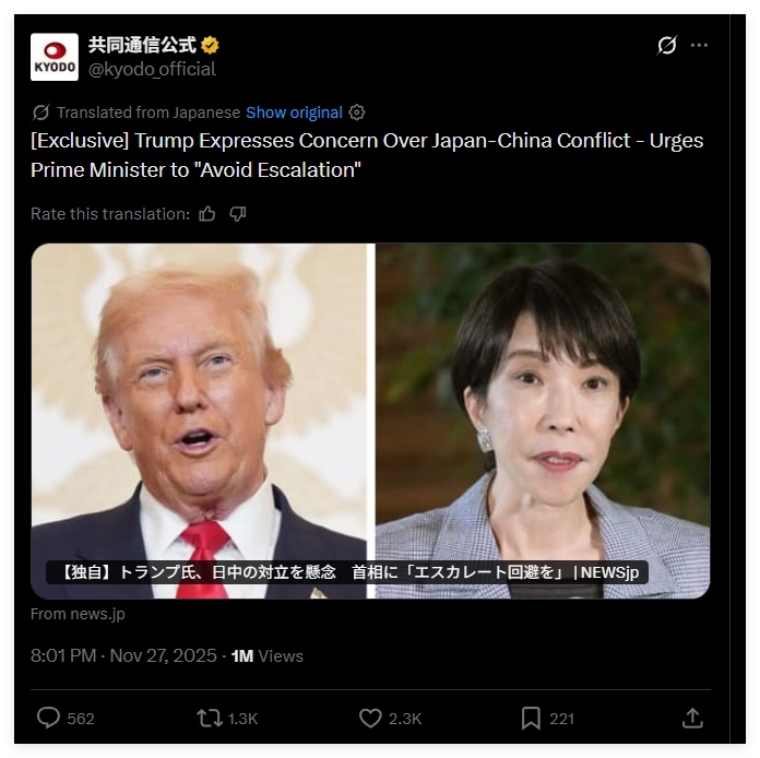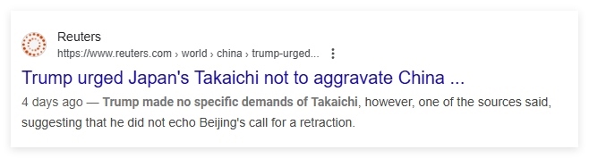 不過,盡管日本政府否認,包括路透社在內(nèi)的更多西方媒體,卻陸續(xù)通過其他信源印證了特朗普讓高市早苗不要刺激中國的情況。就連日本共同社也在報道中提及此事——當(dāng)然,共同社同樣遭到了日本右翼分子的圍攻。