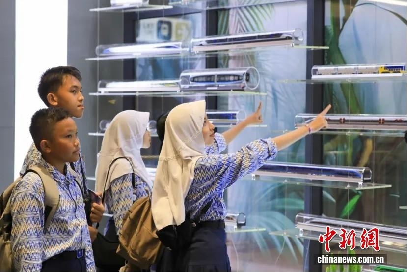 當?shù)貢r間2024年10月17日,一群印尼學(xué)生在印尼雅加達的雅萬高鐵動車組科普文化交流基地參觀。 中新社記者 李志全 攝