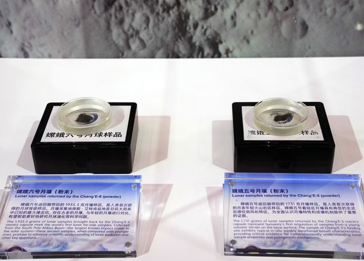 2025年11月5日在第八屆進博會國家展中國館拍攝的“嫦娥五號”月壤和“嫦娥六號”月壤。新華社記者 劉穎 攝