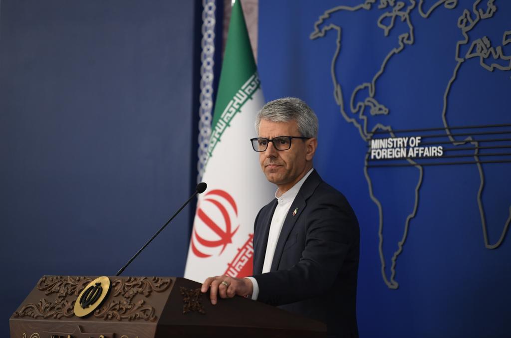2026年2月23日,在伊朗首都德黑蘭,伊朗外交部發(fā)言人巴加埃出席每周例行記者會。新華社記者 沙達(dá)提 攝