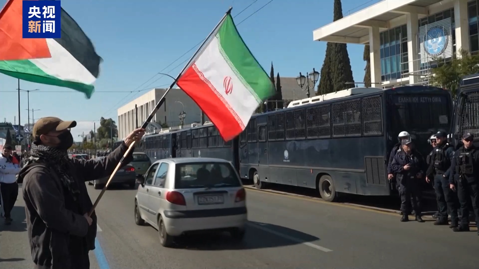 在希臘雅典的美國和以色列大使館前,逾千名示威者手持伊朗國旗或標(biāo)語牌、高喊口號參與游行示威活動,抗議美以對伊朗發(fā)動襲擊。為維護(hù)現(xiàn)場秩序,當(dāng)?shù)爻鰟哟罅烤Σ⒃诿绹鸵陨写笫桂^前使用一排警用大巴封鎖隔離。