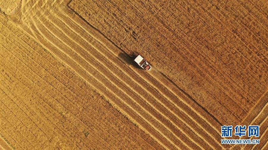 6月2日,在江蘇省淮安市洪澤區(qū),農(nóng)民駕駛農(nóng)機(jī)收割小麥(無人機(jī)照片)。 “三夏”時(shí)節(jié),麥浪滾滾。農(nóng)民在田間加緊搶收,確保小麥顆粒歸倉。新華社發(fā)(陳凱攝)
