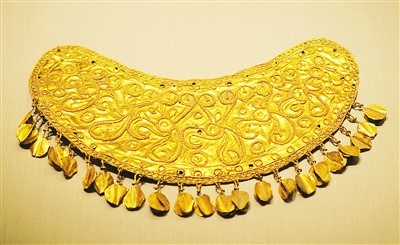 展廳里有不少光彩照人的漢代金飾品,體現(xiàn)了多元文明的融匯。一套出土于鄂爾多斯的金鑲貝玉首飾,由長方形鹿紋金飾牌、方形嵌蚌金串飾、包金玉佩等組成,其中的鹿紋是典型的草原風(fēng)格紋飾,嵌蚌及其周圍的連珠紋工藝則具有波斯等西方文明的工藝特征。一塊出土于通遼的金飾牌,是薩滿主持祭祀活動時佩戴的飾件,中間雕有一高鼻深目、頭戴尖頂帽的女性,兩側(cè)各有一只怪獸,與西伯利亞地區(qū)出土的雙獅守護(hù)圣樹金飾牌極為相似。