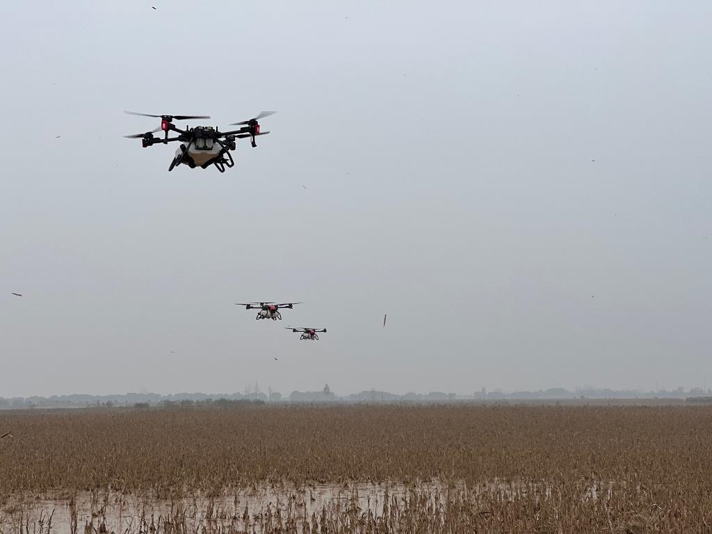 很快,渭南綠盛現(xiàn)代農(nóng)機(jī)專業(yè)合作社理事長(zhǎng)石宇峰就帶著3臺(tái)極飛農(nóng)業(yè)無人機(jī)來到地旁,準(zhǔn)備作業(yè)。記者看到,農(nóng)業(yè)無人機(jī)全程由專業(yè)人員操作,裝種、起飛,按規(guī)劃好的線路和高度在空中播撒,種子沒了再返航續(xù)加,幾個(gè)小時(shí)就完成了飛播。