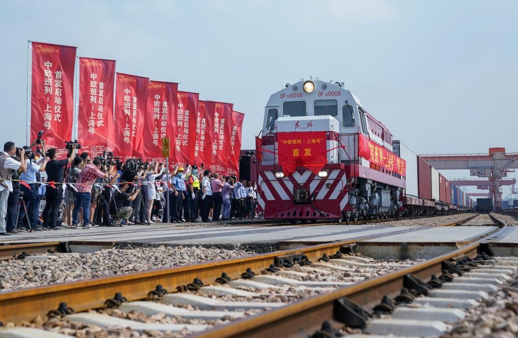 “上海號(hào)”中歐班列從上海首發(fā),駛向德國(guó)漢堡(2021年9月28日攝)。(新華社記者丁汀攝)