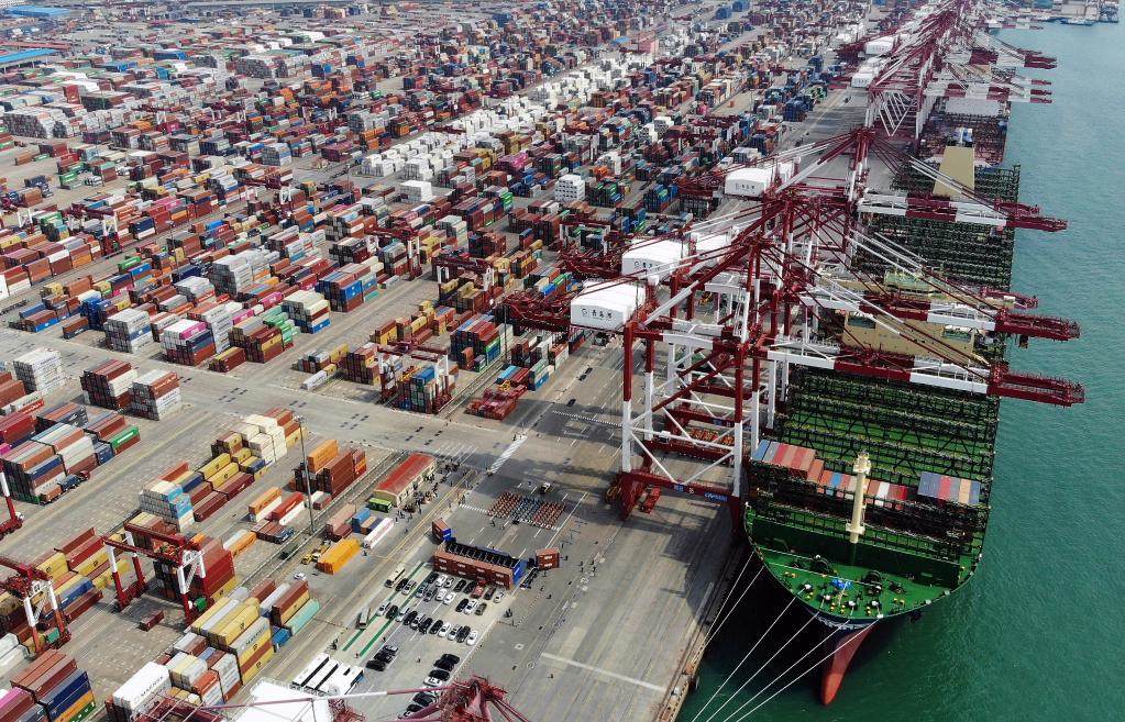 載箱量可達(dá)2.4萬標(biāo)準(zhǔn)箱的“現(xiàn)代商船阿爾赫西拉斯”輪靠泊在青島港前灣碼頭(2020年4月26日攝,無人機(jī)照片)。(新華社記者李紫恒攝)