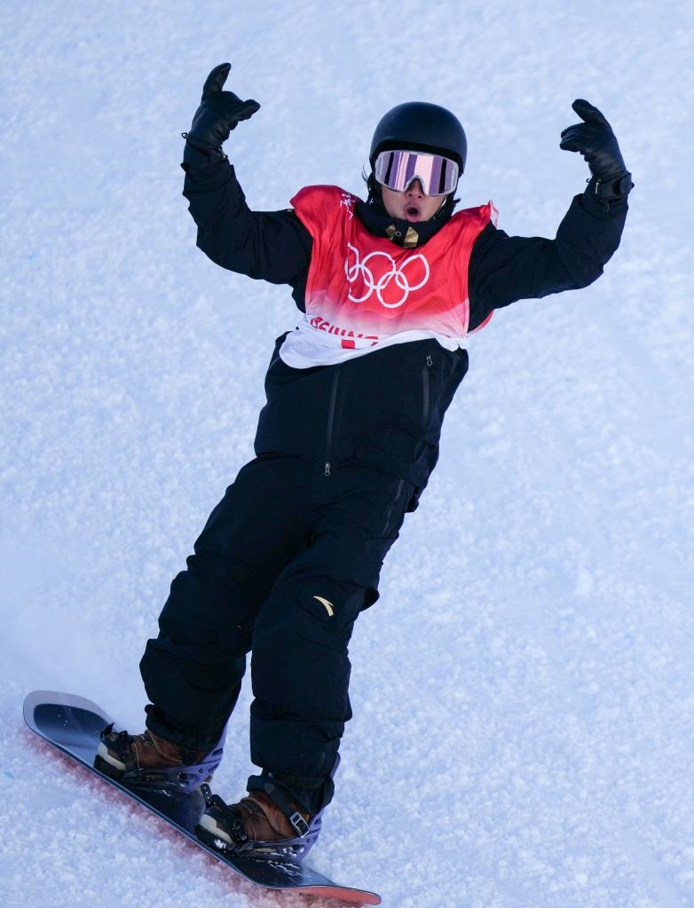 2月6日,中國選手蘇翊鳴在比賽中。當(dāng)日,北京2022年冬奧會單板滑雪項目男子坡面障礙技巧資格賽在張家口云頂滑雪公園舉行。新華社記者薛玉斌攝