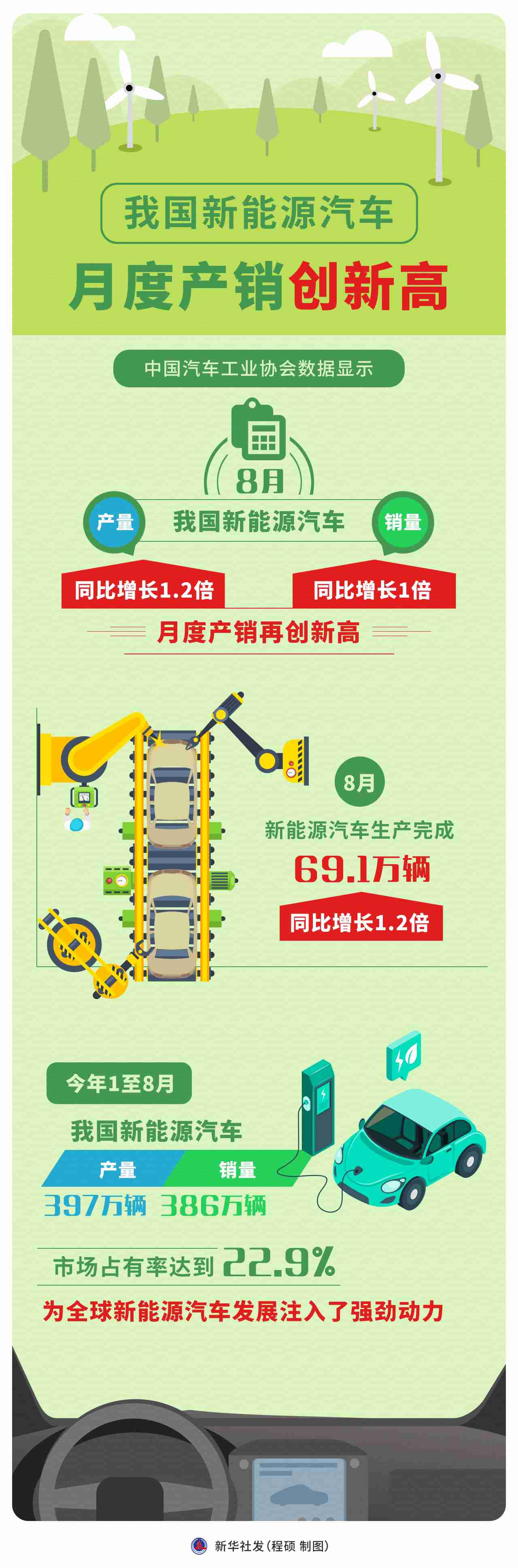 新華社北京9月15日電 題:月度產(chǎn)銷創(chuàng)新高,政策助力新能源汽車發(fā)展