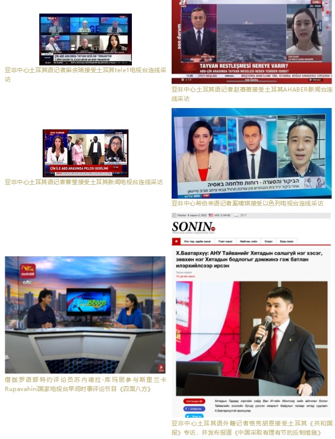 亞非中心土耳其、希伯來語、豪薩語、尼泊爾語、蒙古語等多語種主播、評論員和網(wǎng)紅積極在多家外媒發(fā)聲,接受了包括以色列電視臺、土耳其AHABER新聞臺、土耳其TGRT電視臺、土耳其新聞電視臺等多家國際媒體的采訪連線,同時多名外籍記者、海外特約評論員在尼日利亞《領(lǐng)導(dǎo)者報》網(wǎng)站、尼泊爾《光線新聞網(wǎng)》、肯尼亞《人民報》、蒙古國媒體SONIN.MN等對象國主流媒體發(fā)表評論及署名文章,對外闡釋中方立場和反制措施的合理性、正當(dāng)性,介紹臺灣問題歷史經(jīng)緯,揭批美國在臺灣問題上的背信棄義。