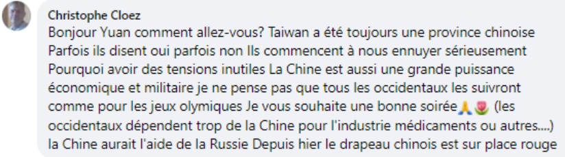 法語網(wǎng)友克羅茲:“臺灣始終是中國的一個省,美國人一會兒承認一會兒又不承認,現(xiàn)在他們又開始搗亂。為什么要制造這種毫無意義的緊張氣氛呢?中國是一個經(jīng)濟和軍事大國,我不認為西方會跟著美國走,就像之前的奧運會一樣,西方國家太依賴于中國工業(yè)了。俄羅斯應(yīng)該是支持中國的吧,昨天紅場上方都飄著中國國旗?!?/p>