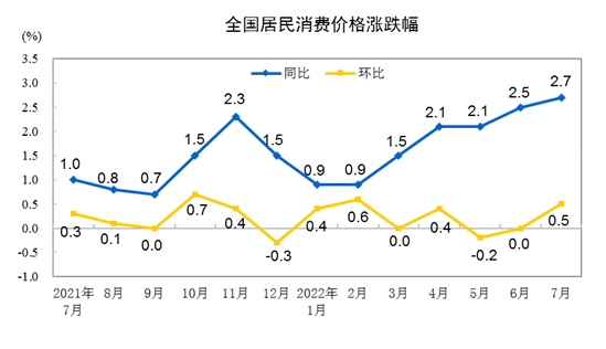 2022年7月份,全國(guó)居民消費(fèi)價(jià)格同比上漲2.7%。其中,城市上漲2.6%,農(nóng)村上漲3.0%;食品價(jià)格上漲6.3%,非食品價(jià)格上漲1.9%;消費(fèi)品價(jià)格上漲4.0%,服務(wù)價(jià)格上漲0.7%。1--—7月平均,全國(guó)居民消費(fèi)價(jià)格比上年同期上漲1.8%。