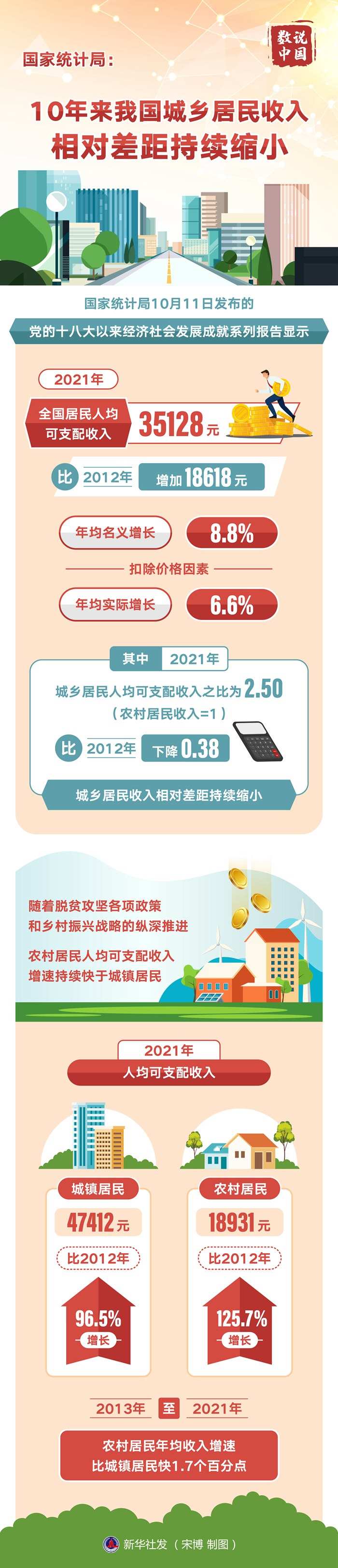 新華社北京10月11日電(記者魏玉坤、嚴(yán)賦憬)國(guó)家統(tǒng)計(jì)局11日發(fā)布的黨的十八大以來(lái)經(jīng)濟(jì)社會(huì)發(fā)展成就系列報(bào)告顯示,2021年全國(guó)居民人均可支配收入35128元,比2012年增加18618元,年均名義增長(zhǎng)8.8%,扣除價(jià)格因素,年均實(shí)際增長(zhǎng)6.6%。其中,2021年城鄉(xiāng)居民人均可支配收入之比為2.50(農(nóng)村居民收入=1),比2012年下降0.38,城鄉(xiāng)居民收入相對(duì)差距持續(xù)縮小。