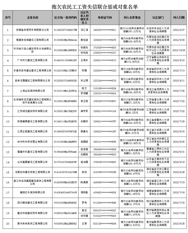 據(jù)人力資源和社會保障部公眾號,根據(jù)《拖欠農(nóng)民工工資失信聯(lián)合懲戒對象名單管理暫行辦法》(人力資源和社會保障部令第45號),人力資源社會保障部現(xiàn)公布一批拖欠農(nóng)民工工資失信聯(lián)合懲戒對象名單。