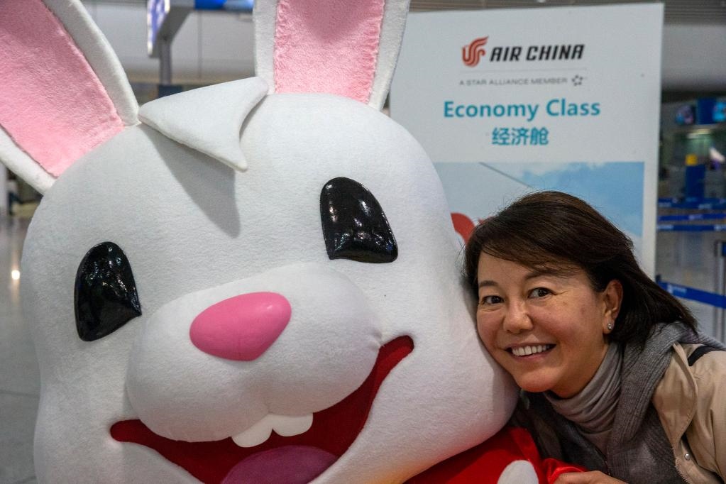 1月26日,在希臘雅典國際機場,一名準備搭乘航班前往中國的乘客與裝扮成兔子造型的工作人員合影。(新華社發(fā),馬里奧斯·羅洛斯攝)