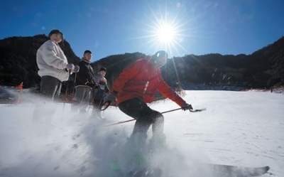 黑崖溝村開(kāi)設(shè)了高山滑雪場(chǎng),教練為孩子們示范滑雪動(dòng)作。