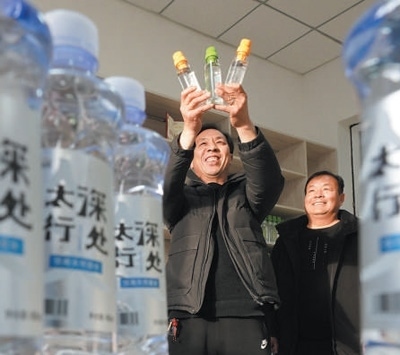 店房村建起飲用水廠,技術(shù)人員在展示產(chǎn)品。