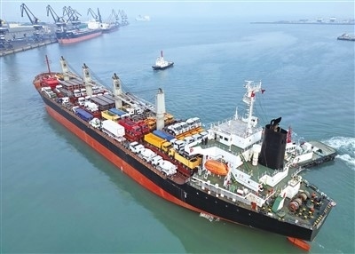 2月23日,中非班輪“塔內斯夢想”輪從山東港口煙臺港起航,前往坦桑尼亞達累斯薩拉姆港。 唐 克攝(人民圖片)